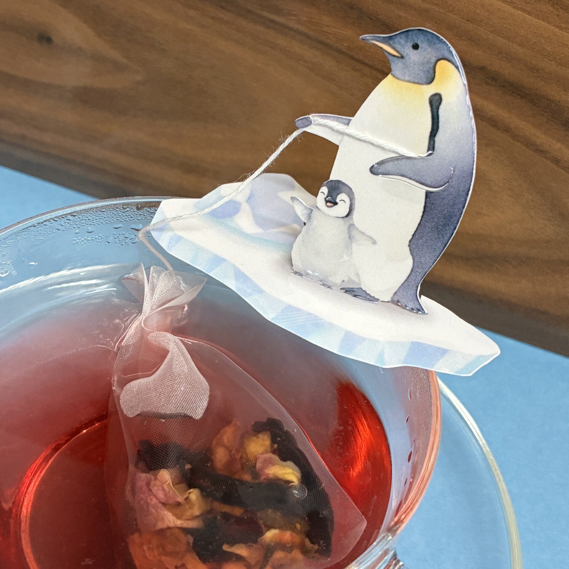 「コップの縁に、小さな癒やしを。」 ペンギンの親子が氷山の上でティーバッグを釣り上げているような、遊び心あふれるデザインのティーバッグセットです。