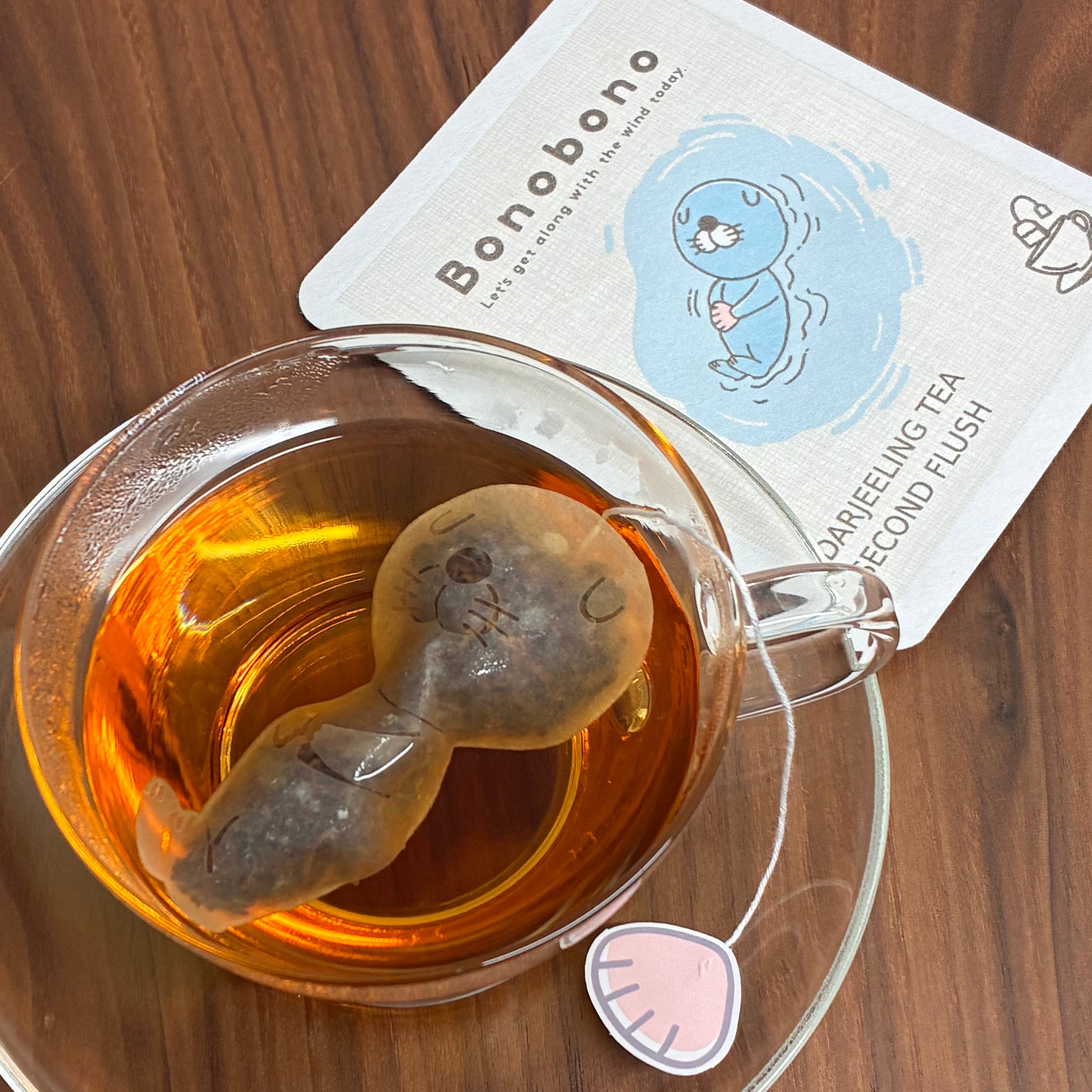 フォトジェニックな仕掛け: お湯を注ぐと、まるでぼのぼのが紅茶の海で「ラッコ浮き」をしているような姿に。
